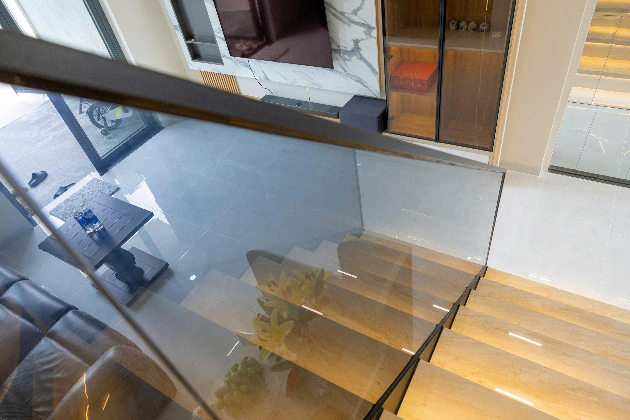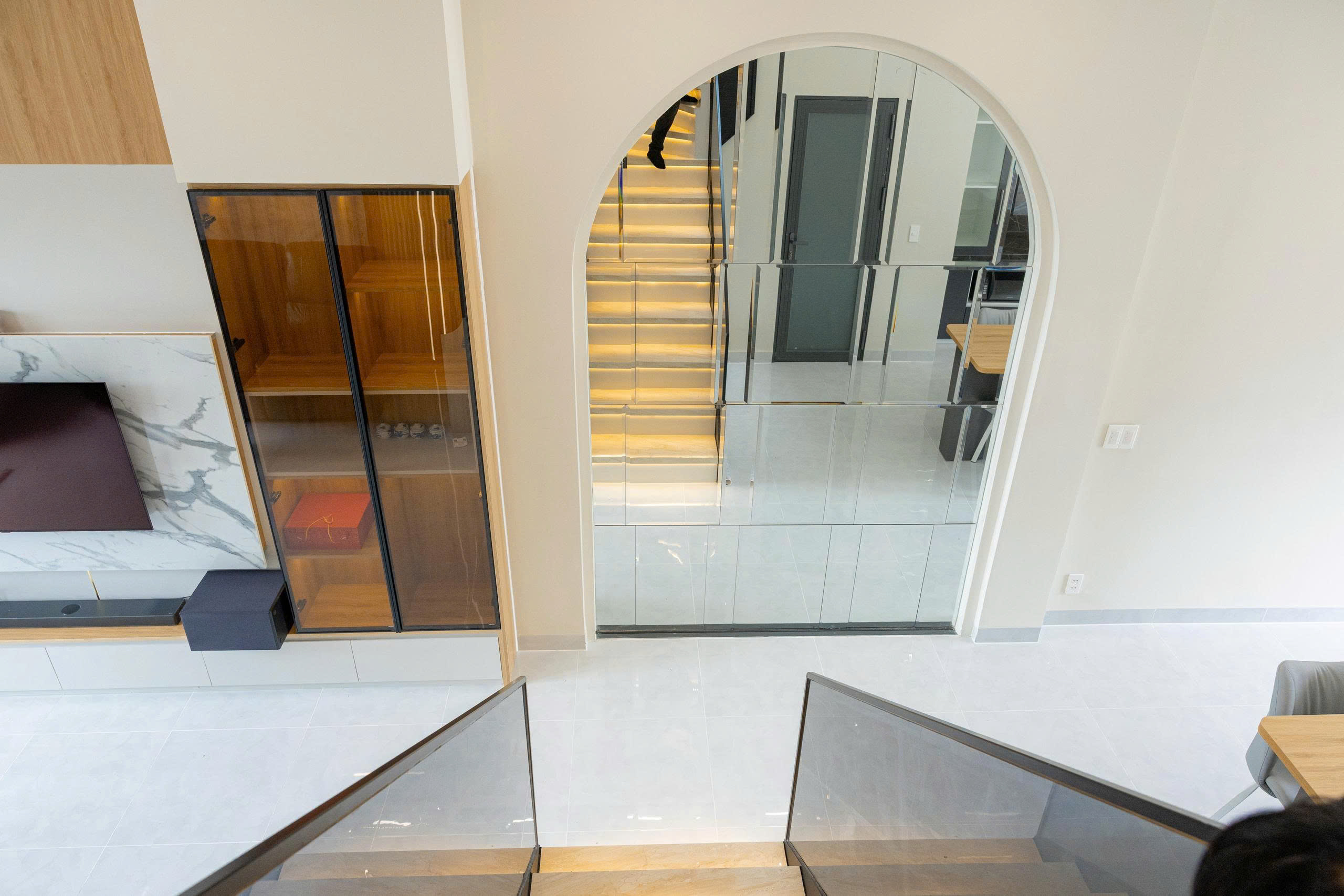 Sân trước và khoảng thông tầng được thiết kế thông thoáng, đón gió và ánh sáng tự nhiên. Đây là điểm nhấn giúp ngôi nhà không chỉ đẹp mà còn thân thiện môi trường. -